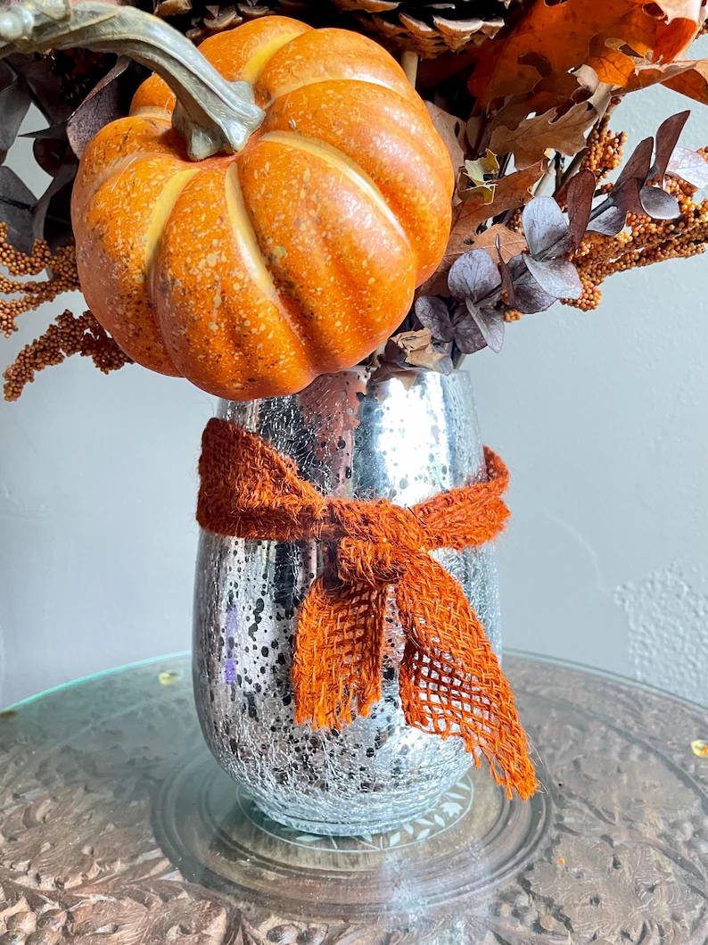 Adorn your space with this eye-catching arrangement: rich pumpkins 🎃, pine cones 🌲, and fall stems 🍁 artfully displayed in a chic silver vase 🪞. This stunning piece brings warmth and elegance to your décor—perfect for Thanksgiving 🦃, greeting guests 👋, or accenting your living or dining room 🏡.