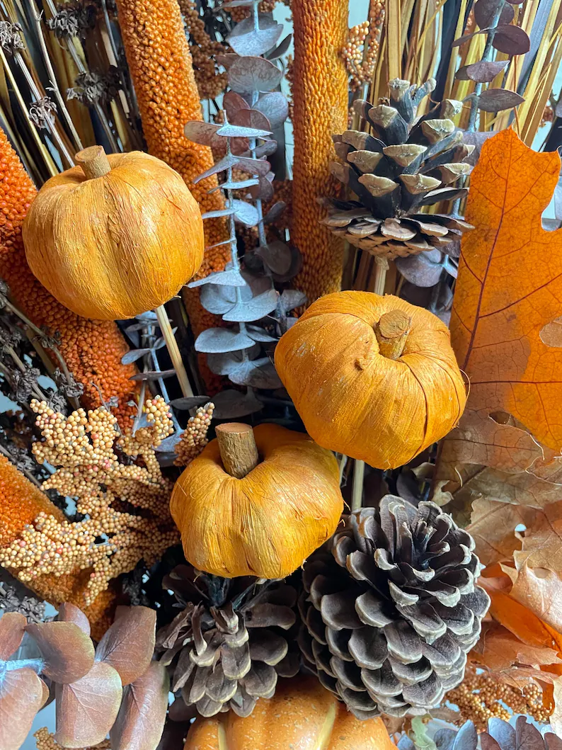 Each arrangement is thoughtfully curated, combining faux pumpkins 🎃, pine cone stems 🌲, seed accents 🌾, and orange burlap ribbon 🎀. Designed to capture autumn’s essence without upkeep—just style.