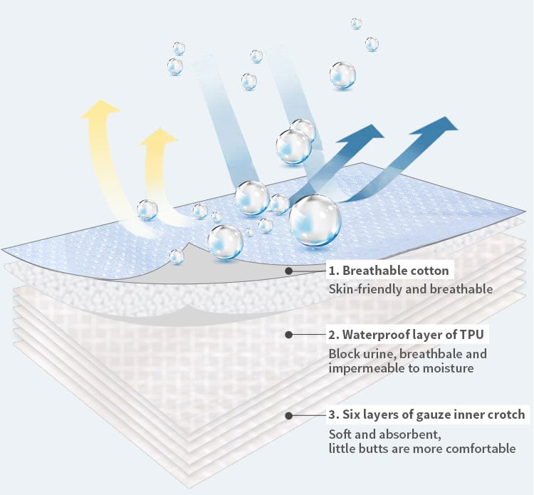 The inner layer is cotton + muslin + TPU, which increases maximum softness and urine absorption. It's cloud-soft to wear and kind to sensitive skin, helping to prevent diaper rashes. Machine-Washable, Dryer-Safe, Washable, Durable and Reusable for multiple uses.