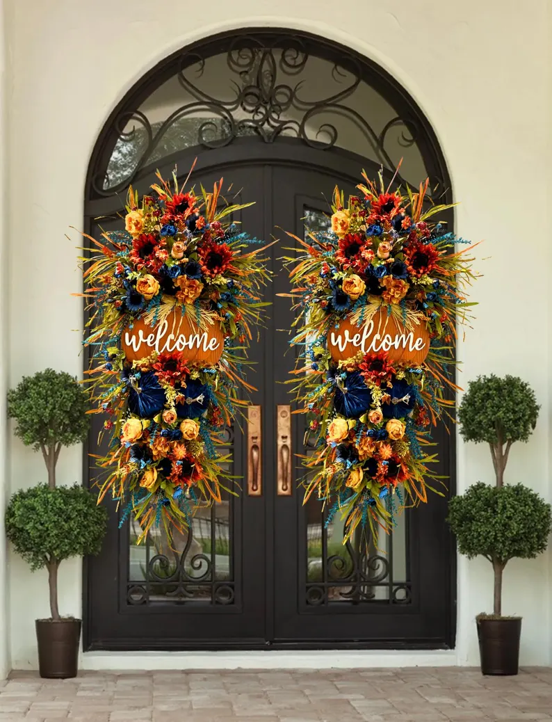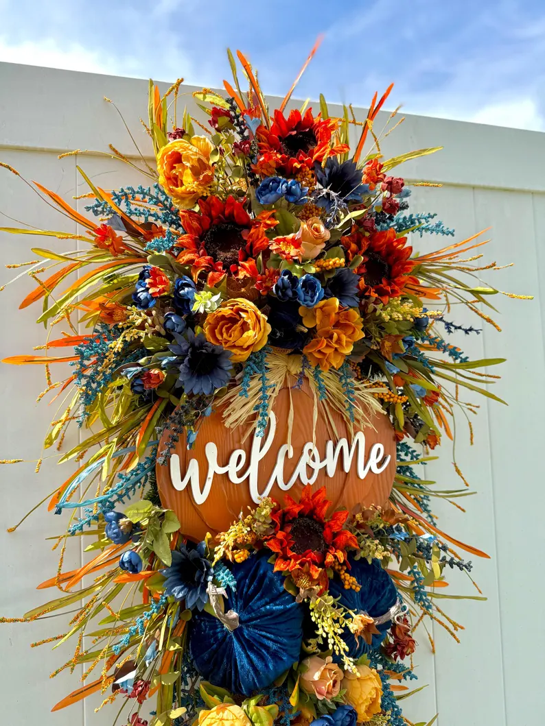 More than just a wreath—this XL double-door arrangement brings bold blue harvest charm to your entryway. Oversized and overflowing with pumpkins, sunflowers, and autumn florals, it’s perfect for making a memorable first impression, whether for Thanksgiving, fall gatherings, or year-round farmhouse flair.
